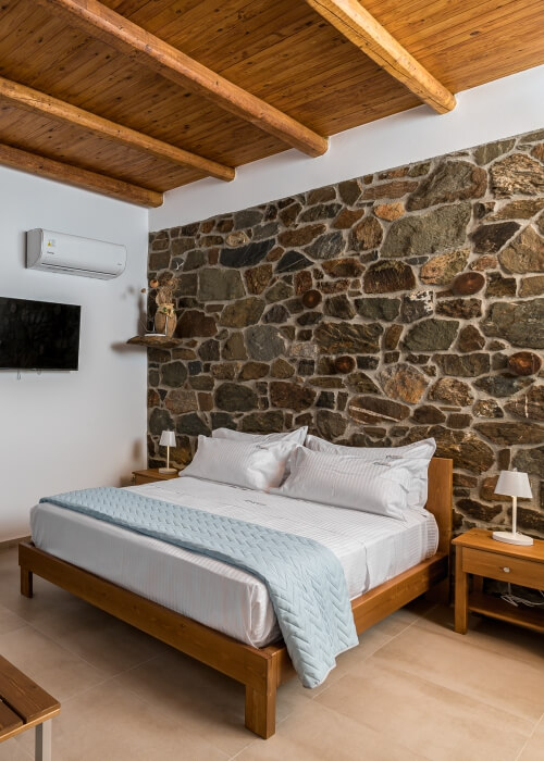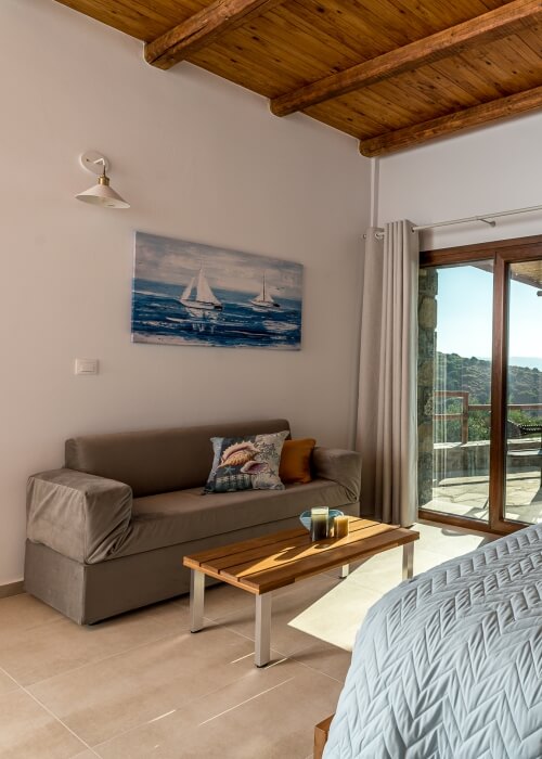 The brand new apartments – traditionally built of stone and wood – are very comfortably furnished and equipped with everything you need for a holiday. The studios have a large double bed, a bathroom with shower, a kitchenette with fridge, stove, kettle, coffee maker and toaster, a living and dining area, satellite TV, air conditioning, Wi-Fi and a terrace with sea or courtyard view. There is also space for one additional person on the sofa bed.