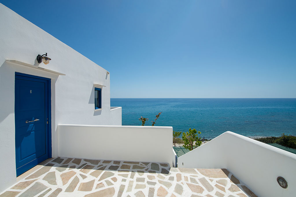 Our beautiful Kionia Studios and Apartments are located on the south coast of Crete, not far from the famous beach of Preveli. It is an apartment complex with a total of 6 units, which have been beautifully placed on a mountainside. All units have a terrace with stunning sea views, internet, air conditioning, satellite TV, a kitchenette, coffee maker and everything you need to prepare your own meals. The two large apartments also have a microwave and a dishwasher. We can offer the right space for 2 to 4 people. Car rental is also included in the price, so you can arrive without complications, because you will need a rental car here in any case. Our accommodation is in an absolutely quiet location and is ideal for those who appreciate and desire peace and quiet. The almost private beach can be reached after a few steps down the hill. But don’t miss out on the numerous other beautiful beaches in the area and explore the almost untouched nature of southern Crete and let yourself be enchanted by the breathtaking landscape. Here, time passes at a different pace and you can truly experience deceleration!