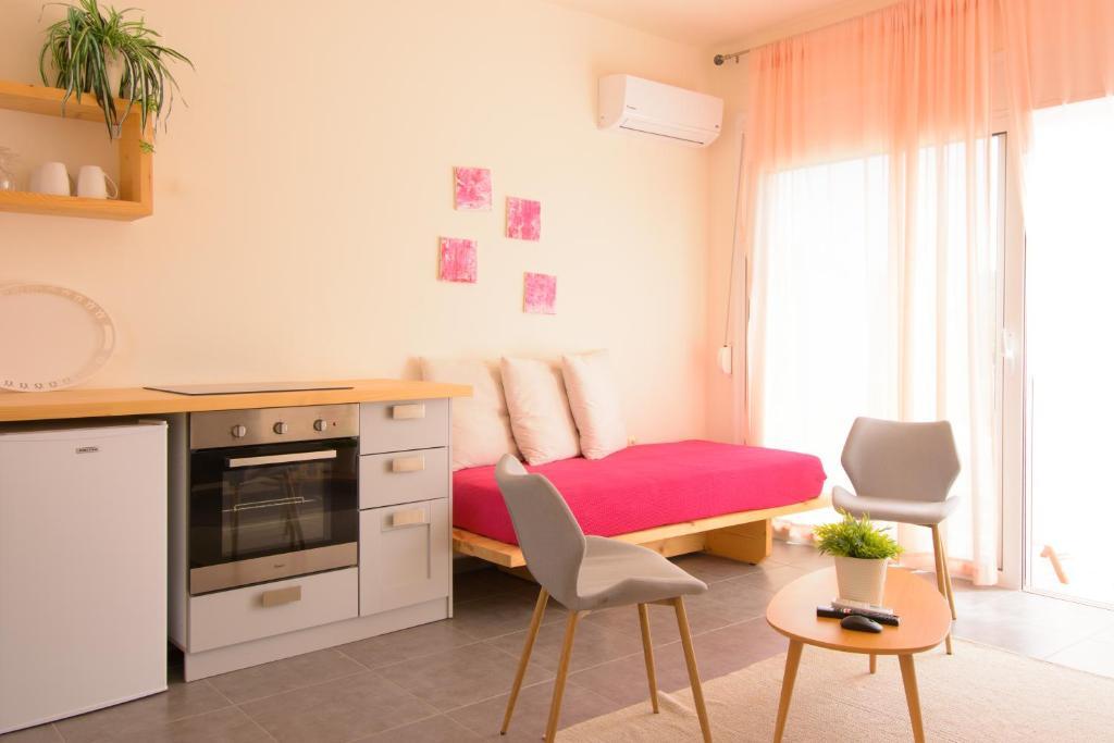 Kitchen, living and dining area, bathroom, bedroom