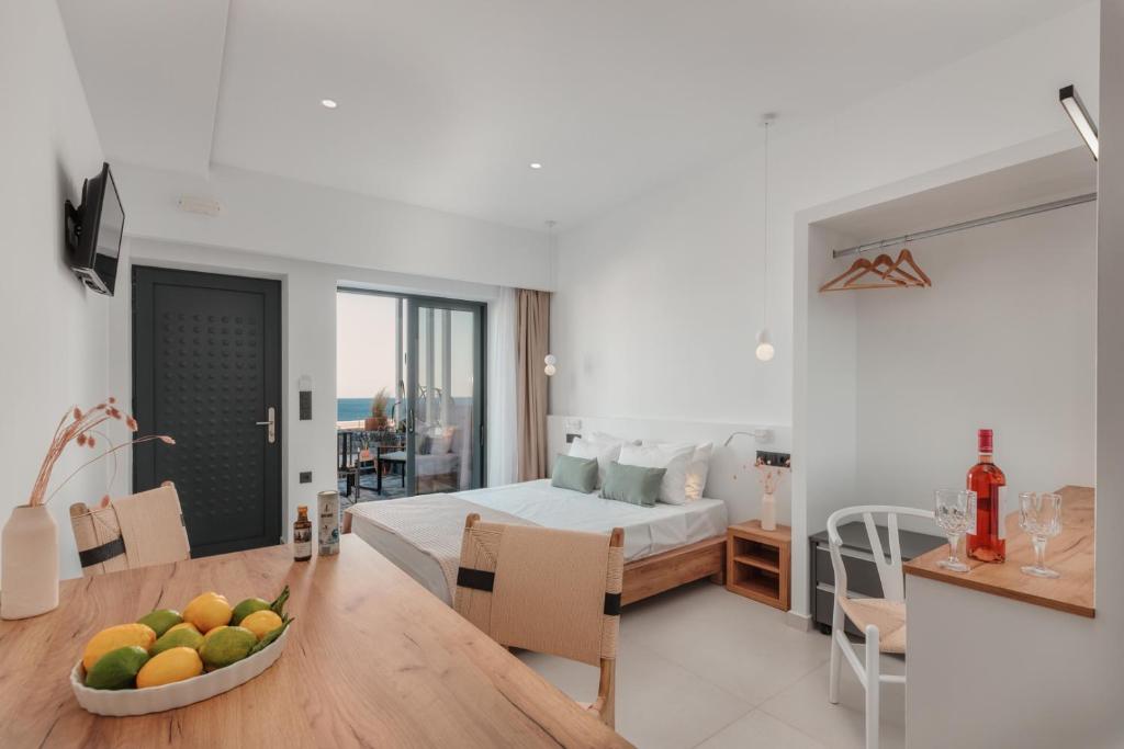 All apartments have a king-size double bed, flat-screen TV, a well-equipped kitchen, a dining area, a bathroom with shower, Wi-Fi and a terrace with pool access and sea view. With us, a rental car is also included in the price.