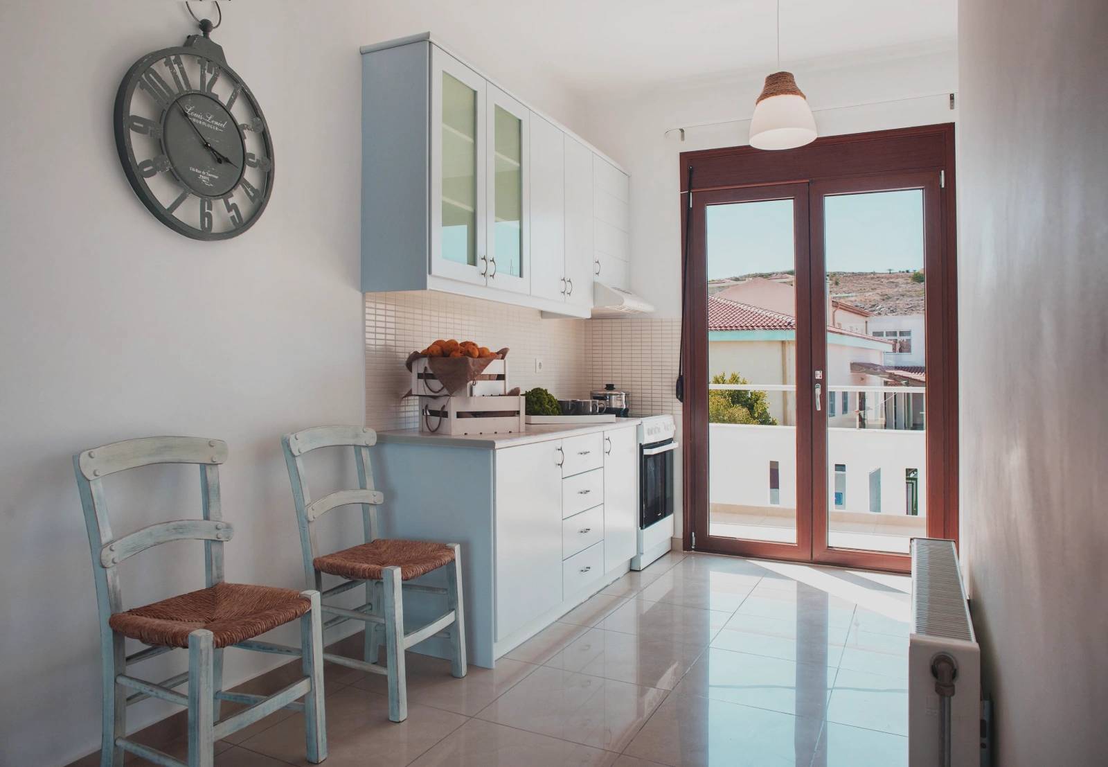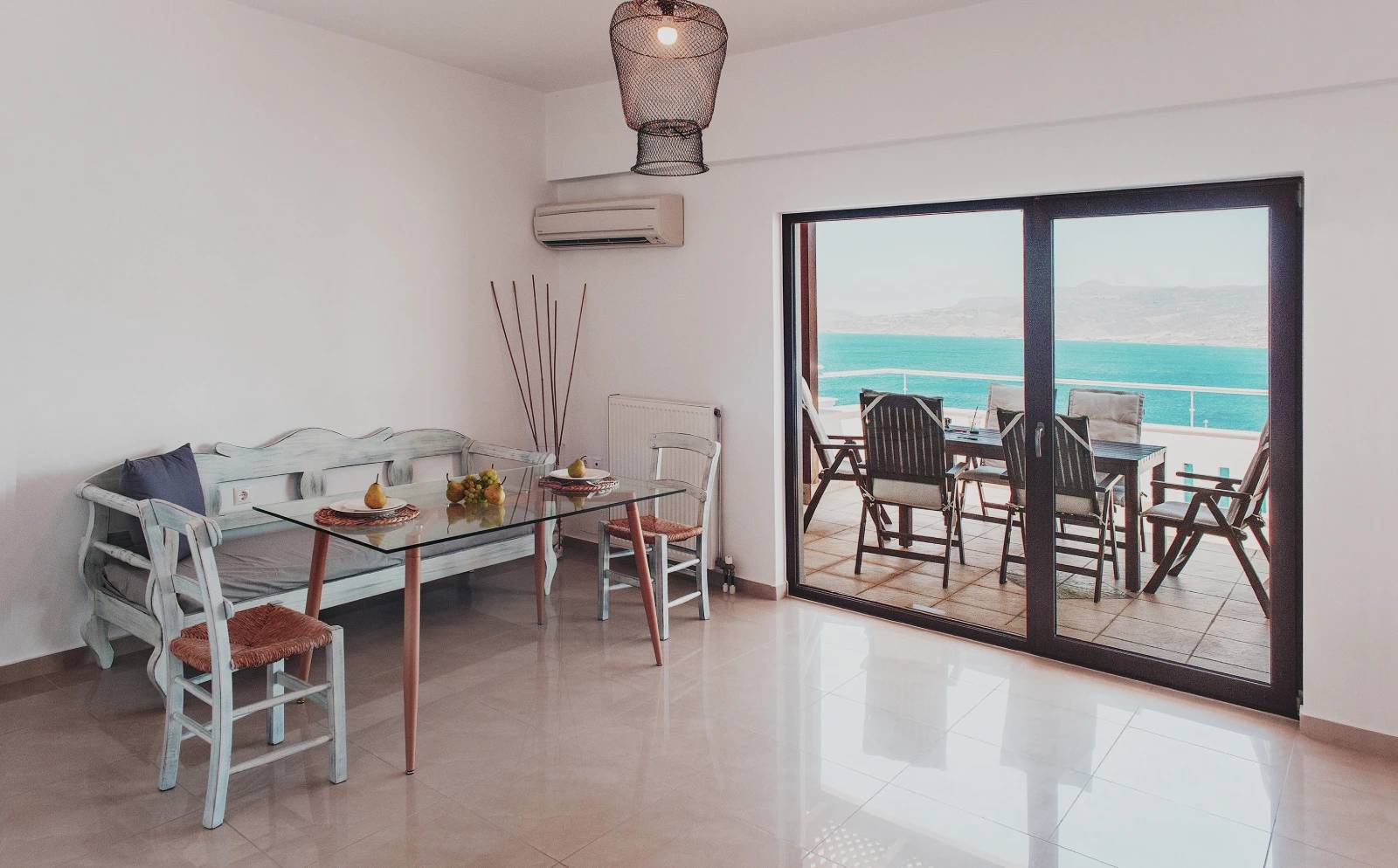 Our dream holiday resort Porto Kaza consists of apartments of different sizes and can accommodate 2 to max. 6 people. All accommodations are warmly furnished and are decorated in a style that combines Mediterranean, country house and shabby chic. The Family Room Apartment has three bedrooms, all with box-spring beds and Coco-Mat natural mattresses, as well as Egyptian cotton bed linen. It also has two bathrooms with a shower and bathtub, a fully equipped kitchen, a living area with a flat screen TV and fireplace, and a balcony with seating and a breathtaking sea view. The family room is 100 square metres in size and is spread over two levels. Toiletries are also provided for you, as well as hand and bath towels. Porto Kaza also has an outdoor pool with sun loungers and an outdoor shower, where you can relax and cool down, and which rounds off the range of wellness options for you. The next highlight for our guests is that we will hand over a rental car to you directly after your arrival at one of the two airports (Heraklion or Sitia), which is already included in our price.