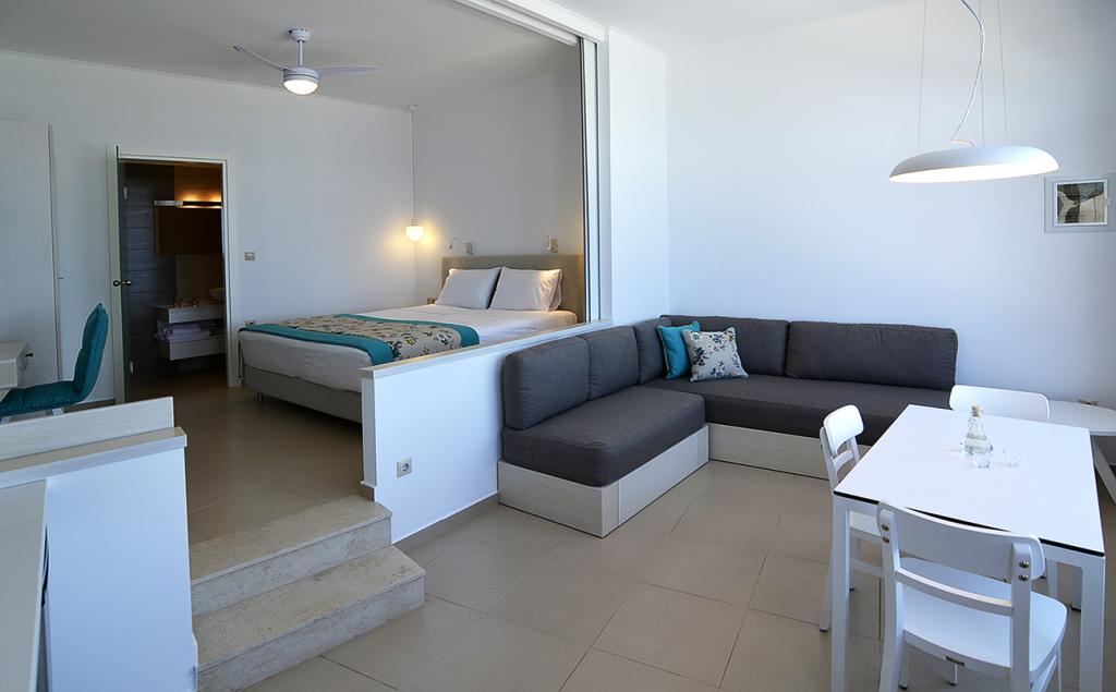 Our Simon Apartments are located just across the coastal road from the beach. The sea view from your own terrace is wonderful and the centre of Sitia can be reached in ten minutes on foot. Ideal for all holidaymakers who do not want to spend all their time on the beach, but would rather go for a stroll or visit the nice restaurants and taverns at the harbour in the evening. The deluxe studios are very tastefully and well thought out furnished – for example, a small ironing board and iron are built into the kitchen cupboard. The beautiful studios (35 square metres) have a visually separate sleeping area with a double bed, a comfortable seating area, a fully equipped kitchen, a modern bathroom, a balcony, a safe, individually adjustable air conditioning, satellite TV with a flat screen and free internet.