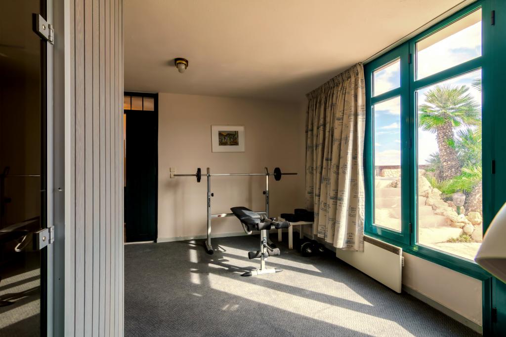 Im Erdgeschoss befindet sich neben einem Schlafzimmer mit zwei Einzelbetten eine komplett ausgestattete Wohnküche mit Bartresen, ein großzügiger Wohn-/Essbereich mit Ledersofas und großem Esstisch. Glas-Schiebetüren führen hinaus auf die teilweise überdachte Terrasse. Zutritt zur Terrasse hat man außerdem vom Fitnessraum, wo sich auch ein Dampfbad befindet. Ein Masterbedroom mit Sitzbereich, Badezimmer aus kostbarem Marmor und privatem Balkon sowie ein weiteres Doppelzimmer und ein Badezimmer liegen im Obergeschoss. Entspannung finden Gäste der Villa im Hamam.
